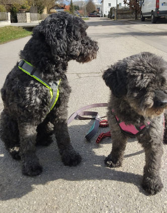 Von unserer Rasse her sind wir Puli-Mischlinge – ungarische Hütehunde, die als clever, anhänglich und treu gelten. Unser wuscheliges Fell macht uns unverwechselbar, und unser freundliches Wesen bringt jeden zum Lächeln. Hier in Deutschland waren wir mit unserem Pflege-Frauli auch beim Hundefriseur. Sehen wir jetzt nicht schick aus? Gut, für die kalten Monate brauchen wir aktuell Mäntelchen, aber auch die stehen uns ganz vorzüglich 😉