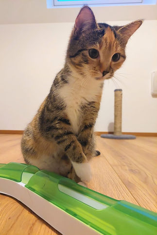 Ich liebe es aber auch zu spielen und zu toben. Ich bin flink und wendig und jage gerne Stoffmäuse und Federn. Aber ganz besonders gefallen mir Kugelbahnen. Damit kann ich mich stundenlang selbst beschäftigen.